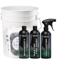 Komplett bilpleiepakke: forvask, pH-nøytral felgrens, shampoo, mikrofiber vaskehanske og 18 L bøtte. Skånsom bilvask med proffe resultater hjemme.